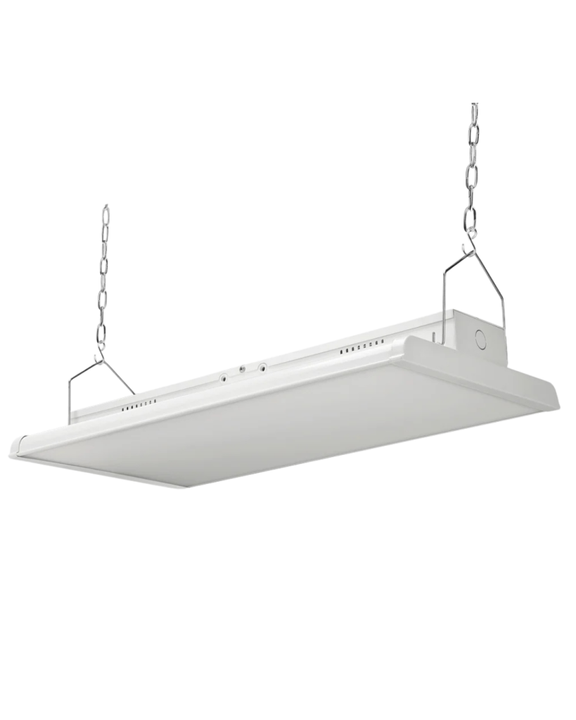 Linear high bay fixtures are one of the most common solutions for warehouse lighting. A linear high bay light distributes light evenly across wide aisles, making it ideal for pallet rack rows and warehouse storage areas.